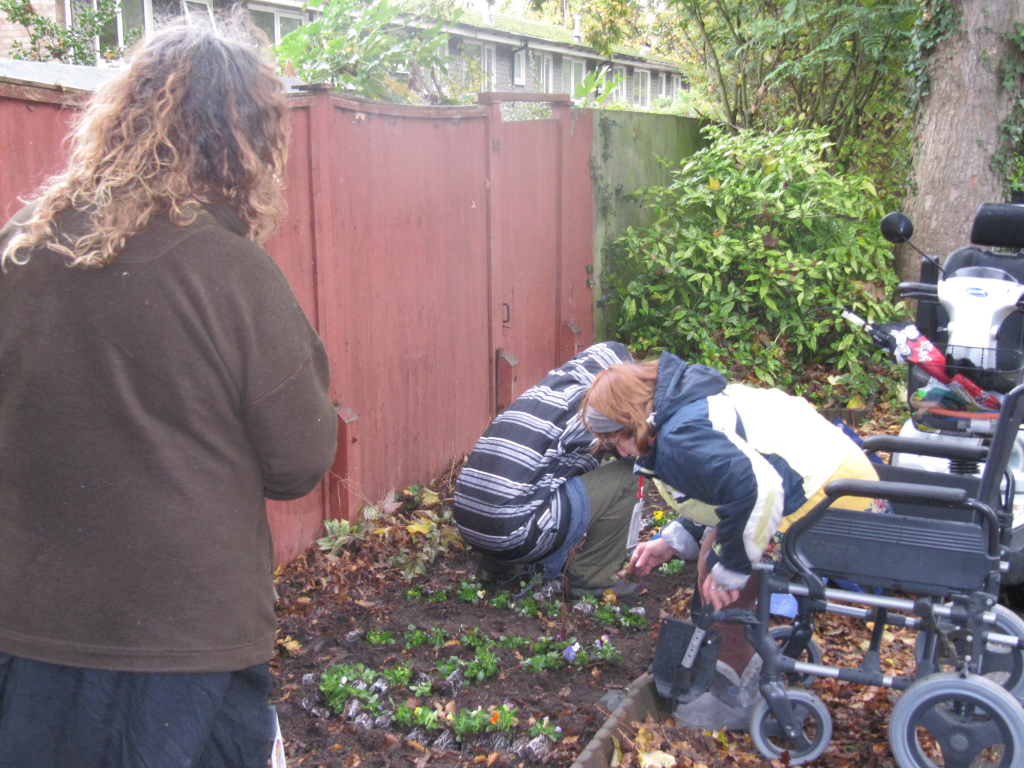 | Ed Nugent Cambridge City Council teaching SOS volunteer how to plant and stake a tree (photgraphing vol for our Blog) If you’re walking down Red Cross Lane, why not bring an extra bottle of water for the new mini fruit orchard there? Hope’s Friendship Garden on Red Cross Lane has been extended – by Anna’s Tree – to now have Ed’s Orchard, celebrating the Cambridge City Council employee who led this community “to take back their streets, develop a biodiverse area and engage families and neighbours to create a more active community”. |