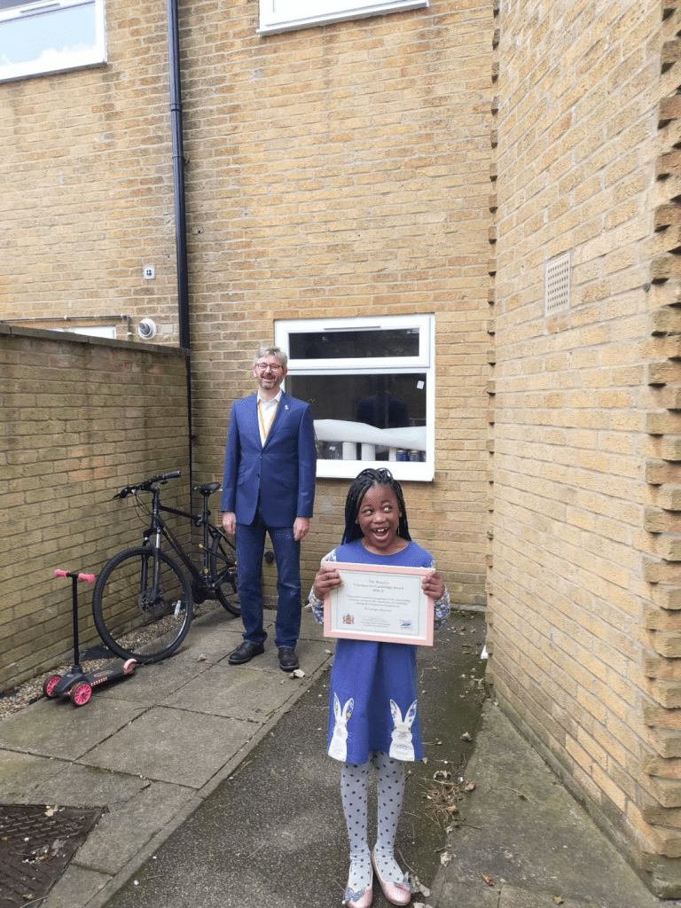 Councillor Sam Davies met and awarded Children’s Committee a plaque for Hope’s Friendship Garden